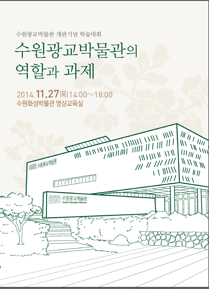 사이트 전체메뉴 이용안내 관람안내 시설안내 시설물현황안내 1층 시설안내 2층 시설안내 소장품이용안내 기증안내 오시는 길 전시안내 상설전시 광교역사문화실 소강실 사운실 기획전시 틈새전시 야외전시 야외전시 박물관주변둘러보기 온라인박물관 교육 어린이체험실 교육안내 행사안내 교육영상 자료실 도서자료 이용안내 발간자료 도록 학술자료 교육자료 기타 유물자료실 소장유물 검색 열린마당 공지사항 박물관소개 인사말 연혁 조직 및 부서 박물관 로고 사이트맵
