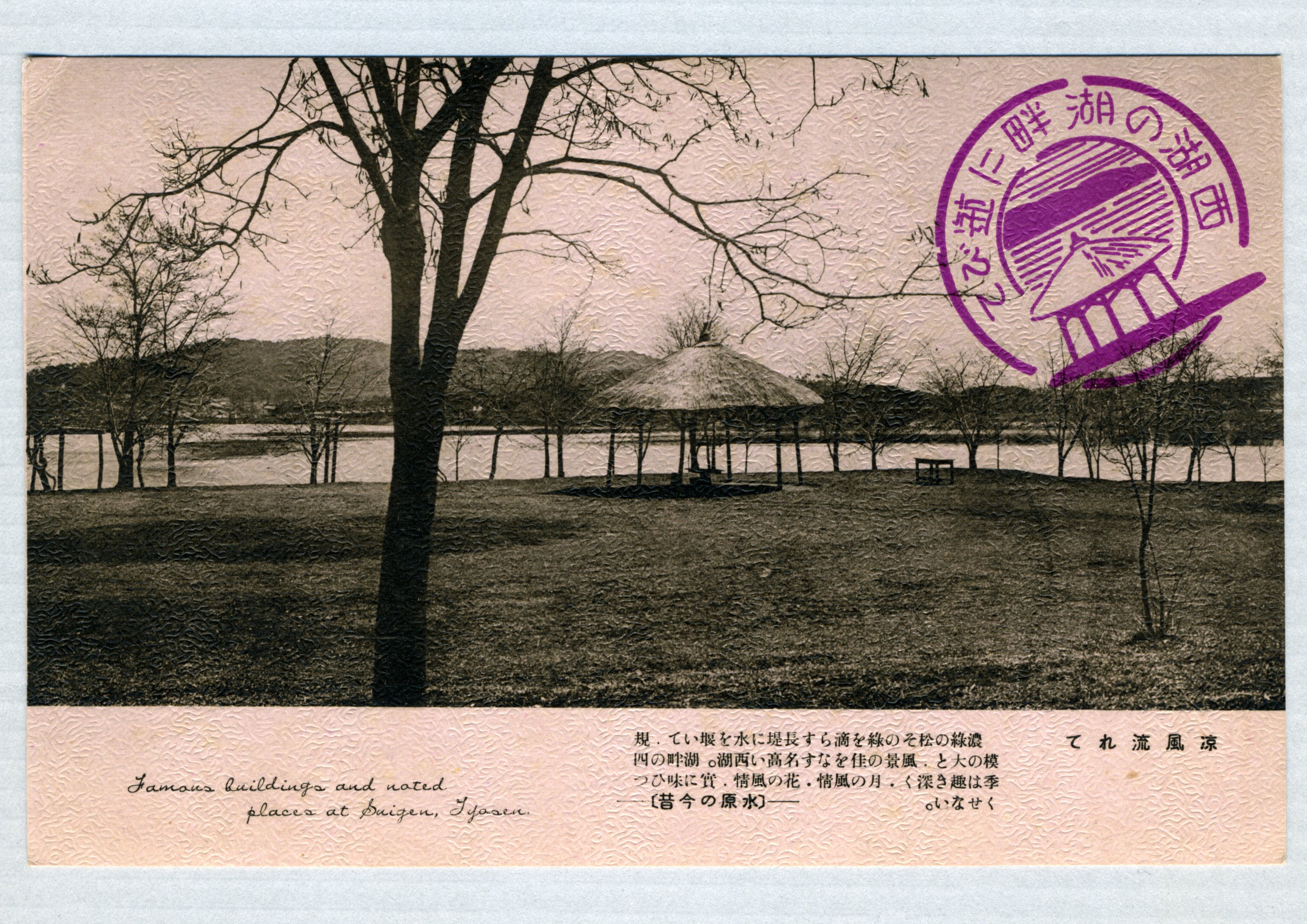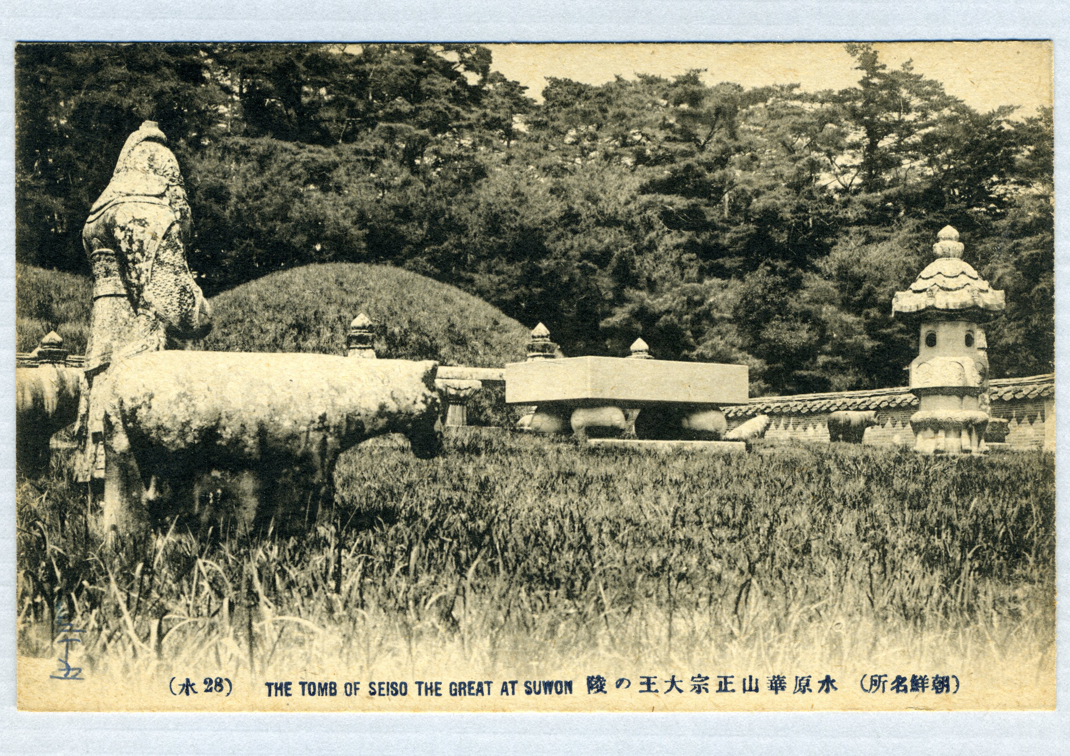 정조선황제와 효의선황후가 합장되어 있는 건릉의 모습을 찍은 사진엽서로 채색되어 있다.