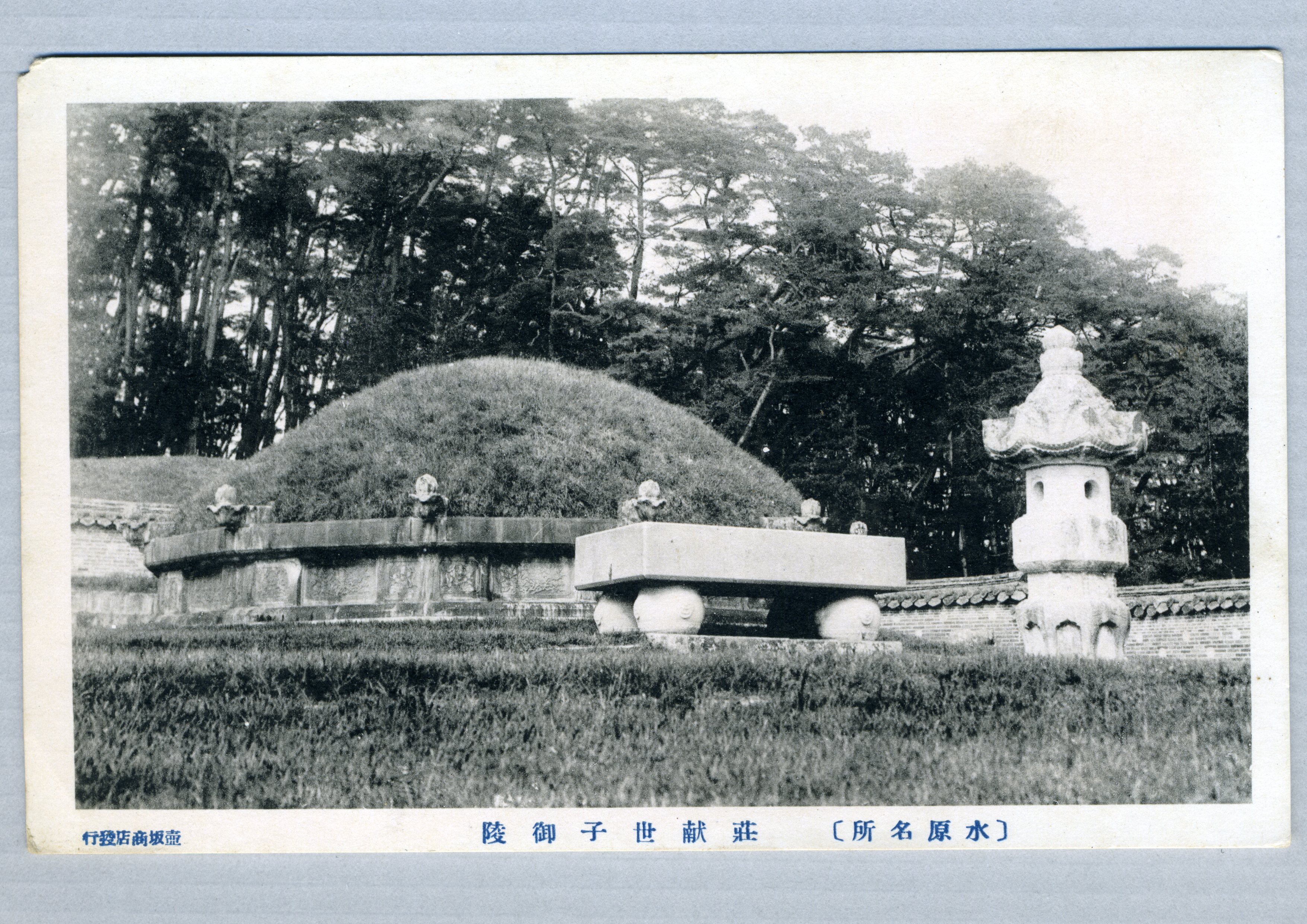 추존된 장조의황제(장헌세자)와 헌경의황후가 합장되어 있는 융릉의 모습을 찍은 사진엽서다.