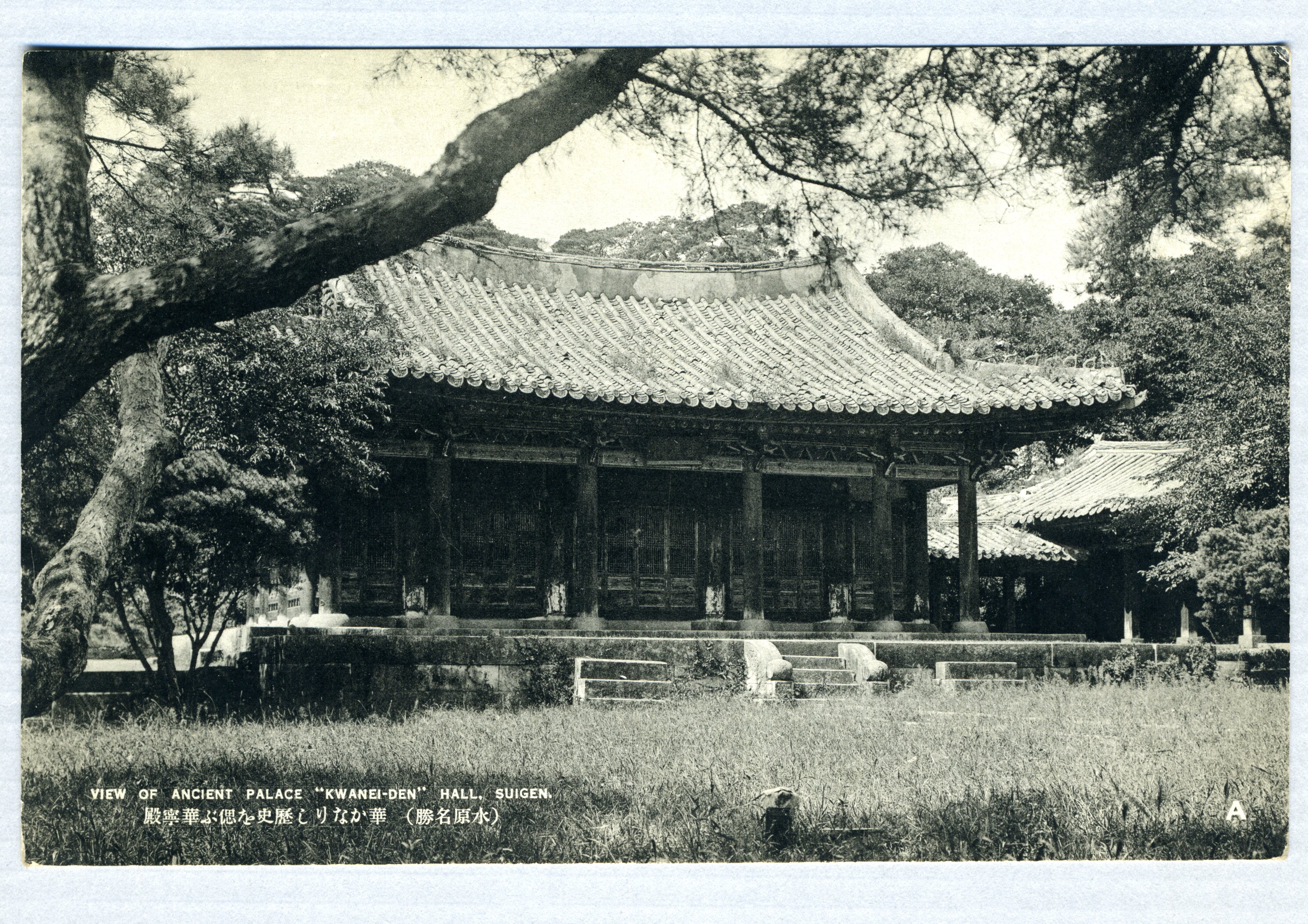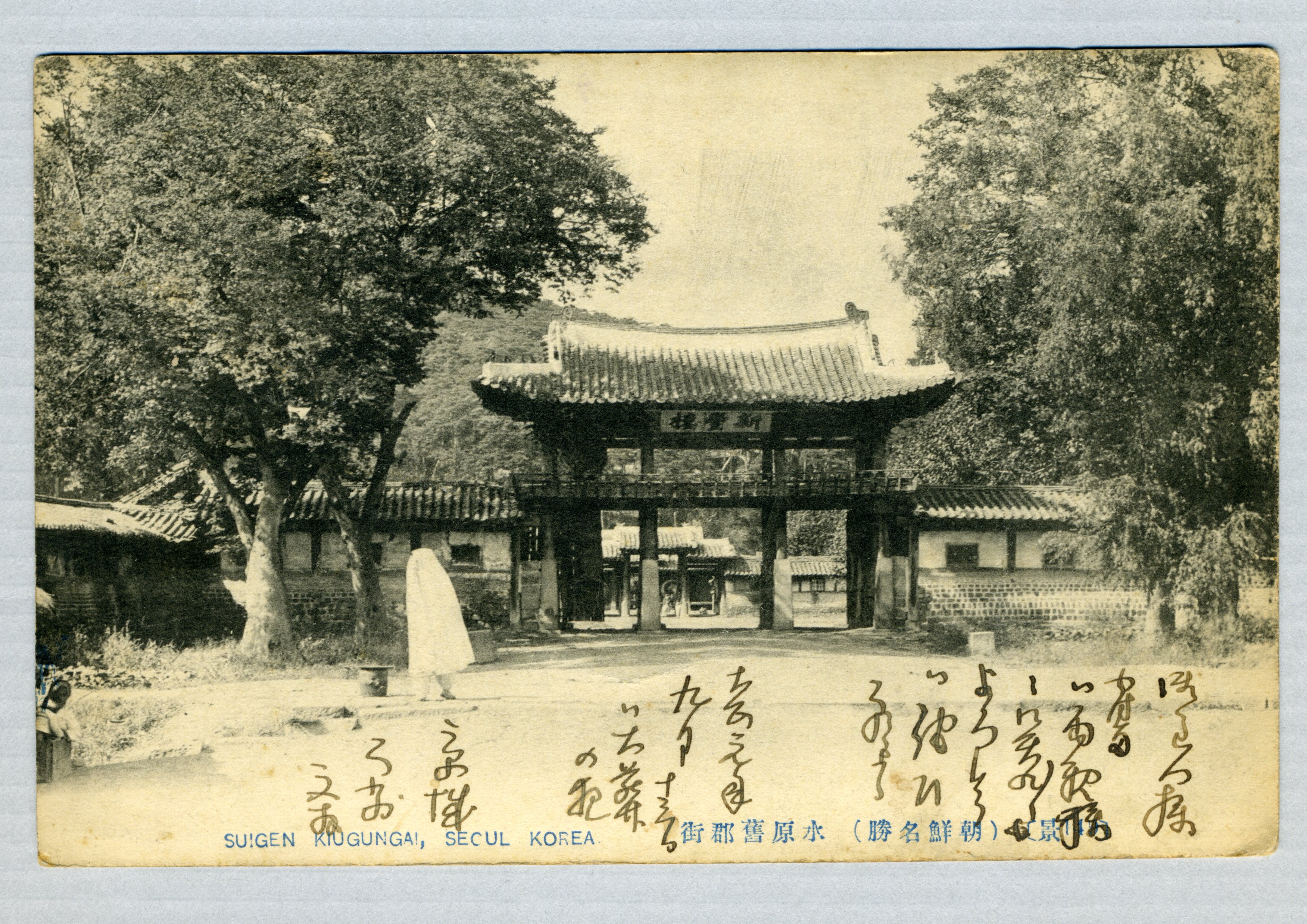 화령전과 그 앞 길에 서 있는 순사의 모습을 찍은 사진엽서다.