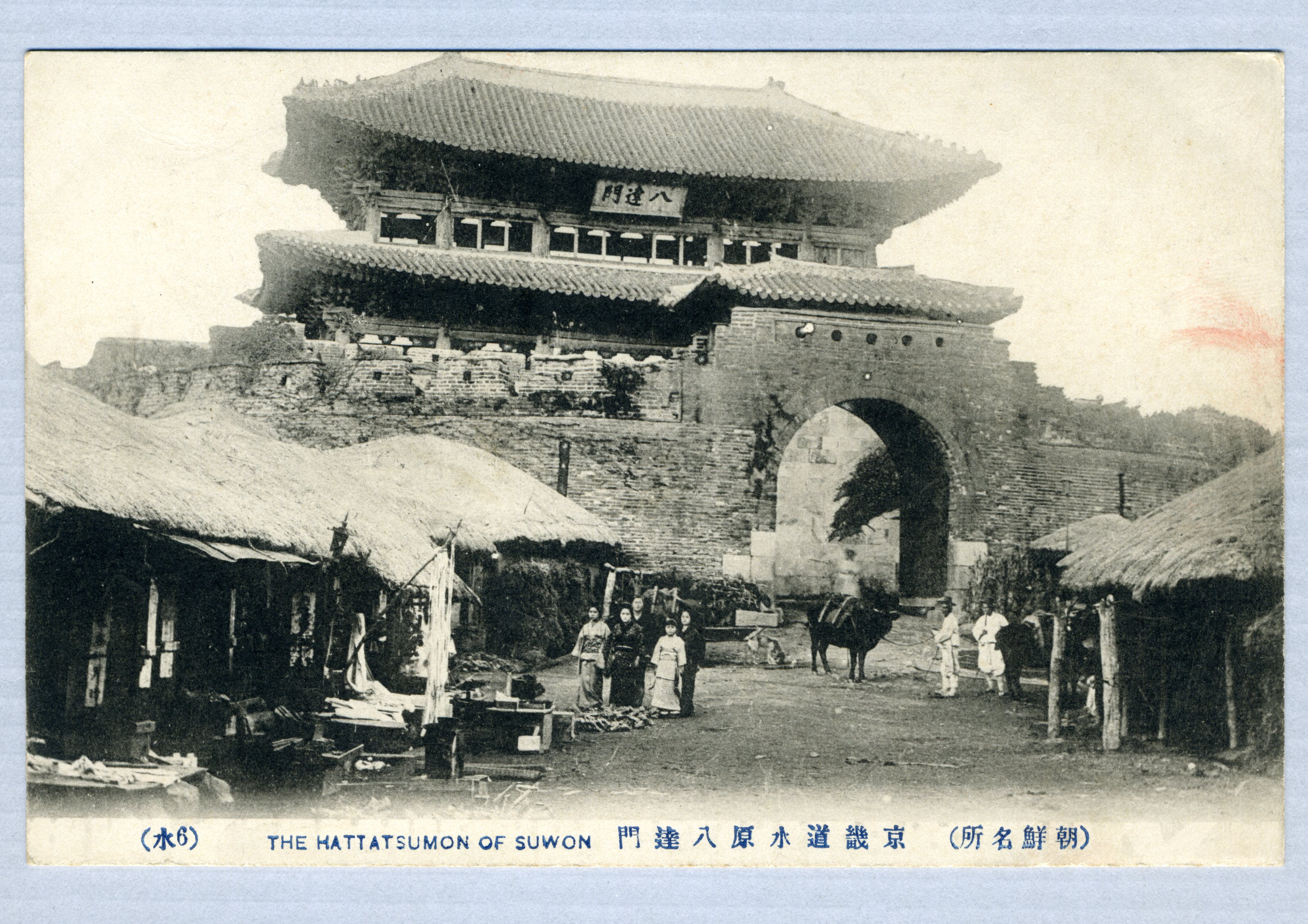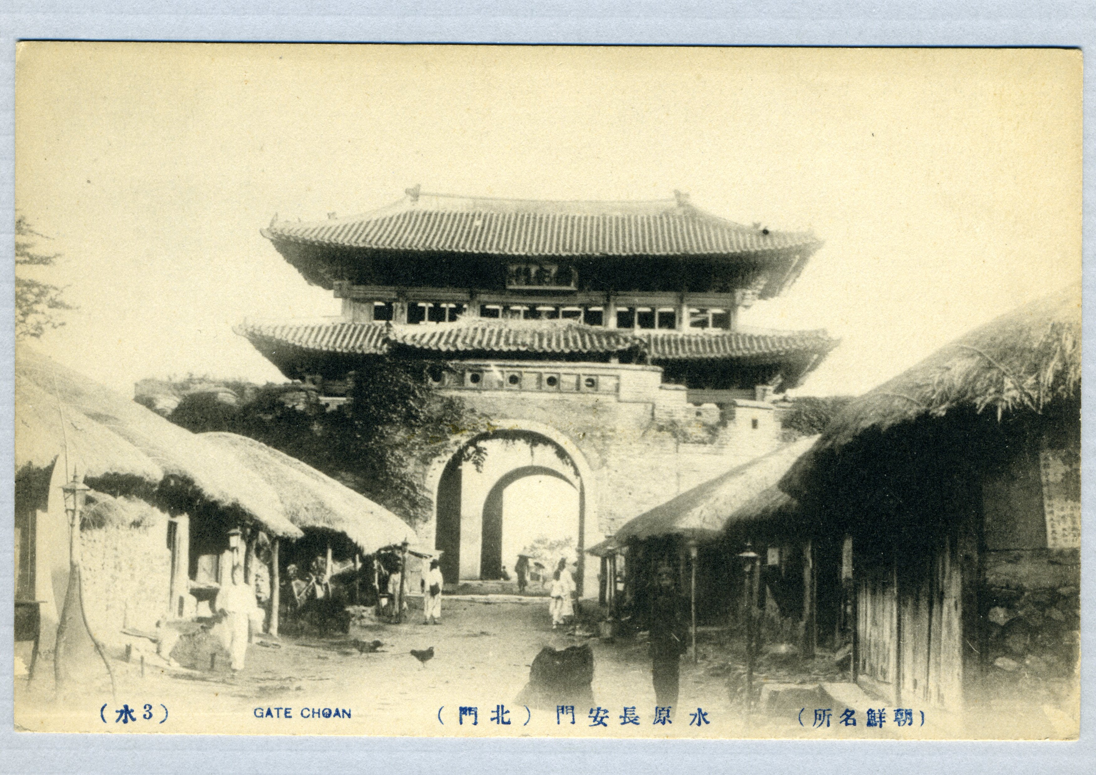 장안문과 그 앞의 초가집을 찍은 사진엽서다.