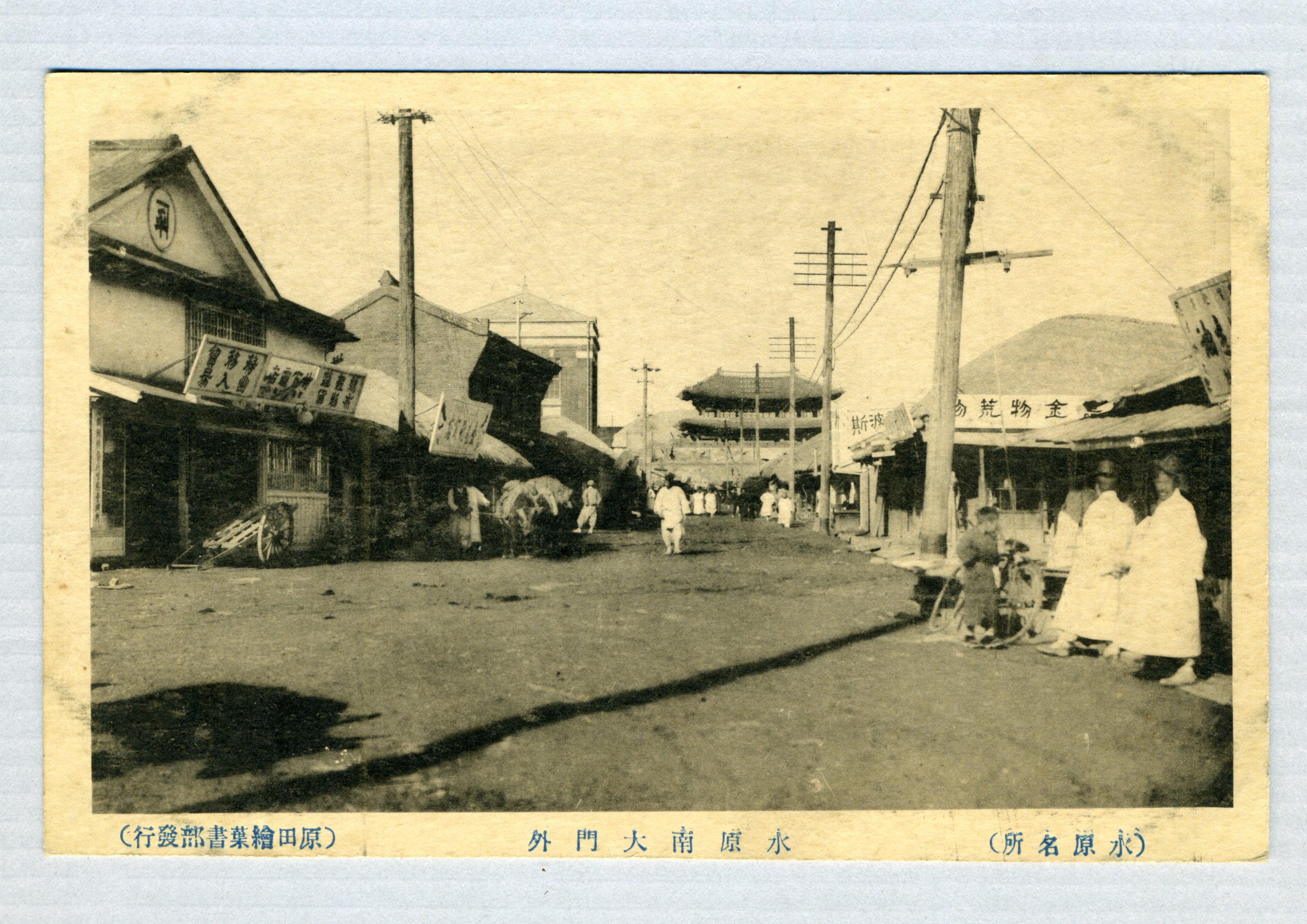 팔달문의 모습과 그 앞의 상점을 찍은 사진엽서다.