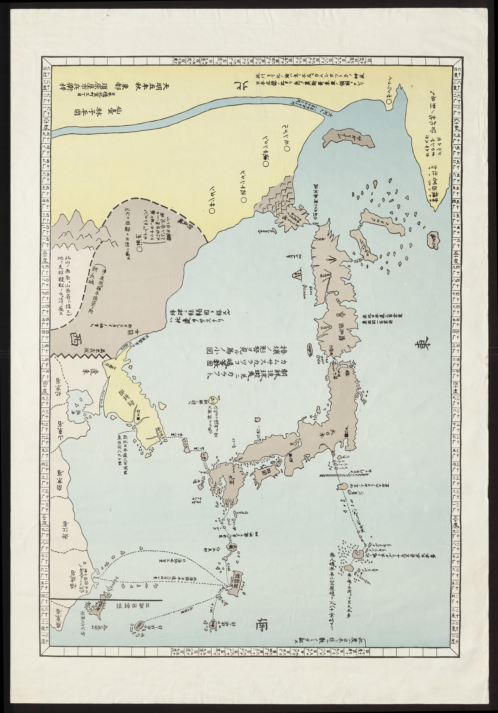 일본의 대표적인 실학자 하야시 시헤이林子平(1738~1793)가 제작한 지도다. 삼국(조선朝鮮, 유구국琉球國, 하이국蝦夷國)을 색채를 달리하여 그렸다. 조선과 일본 사이의 바다 한가운데 큰 섬 하나와 그 오른쪽에 작은 섬 하나를 붙여 그렸다. 이 섬들은 모두 조선과 같은 색으로 칠해져 있다. 왼쪽 큰 섬에는 다케시마竹島로 표기한 다음 그 아래에 “朝鮮ノ持之(조선이 소유하고 있다)”와 此島ヨリ隱州ヲ望 又朝鮮ヲモ見ル(이 섬에서 은주가 보이고 또 조선도 보인다)“라고 기록하여 울릉도와 독도가 우리 영토임을 명확히 밝히고 있다.