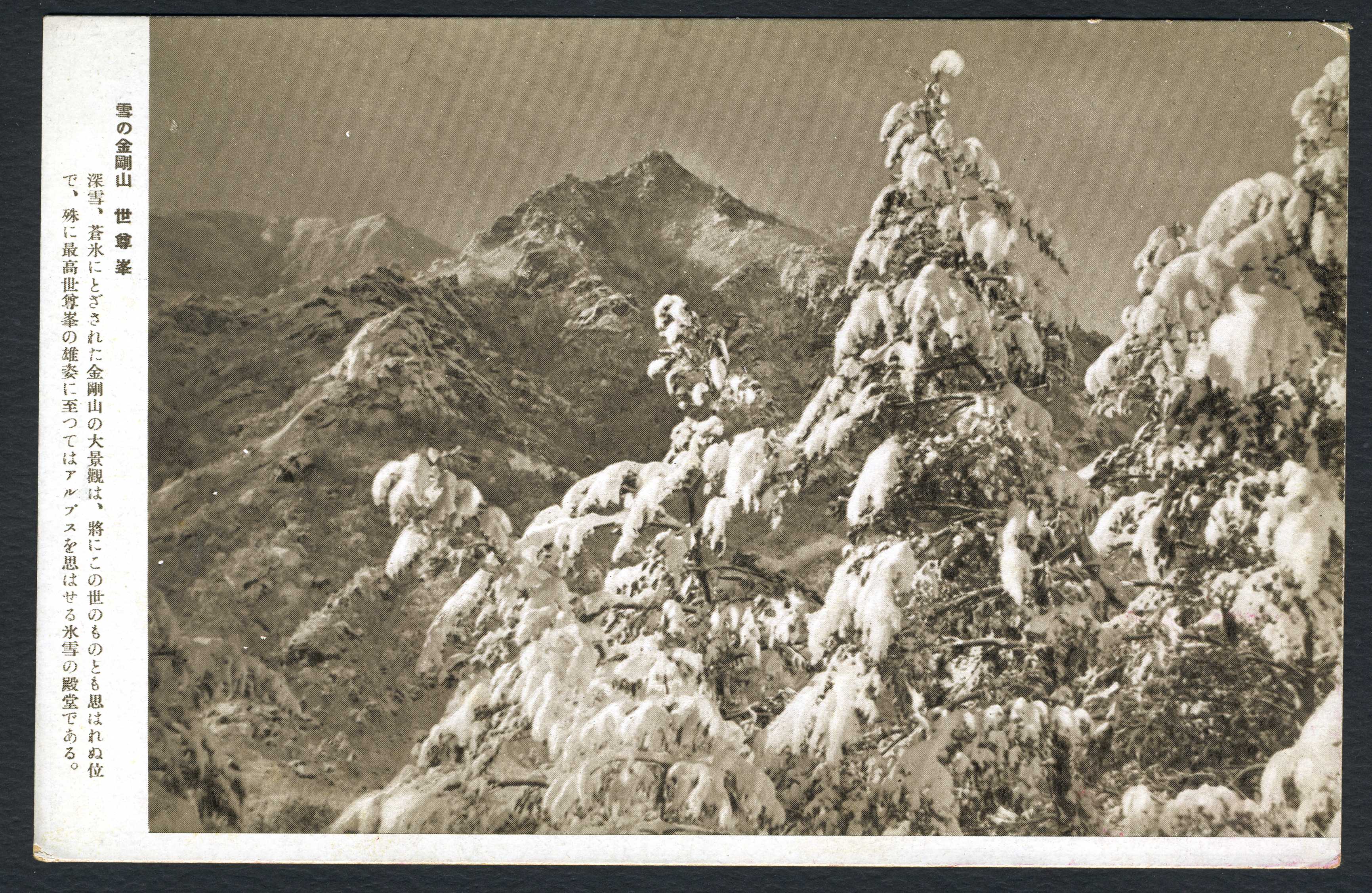 눈내린 금강산 세존봉(世尊峰) 사진이 인쇄된 엽서이다. 좌측에는 금강산 세존봉 설경의 아름다움을 설명한 글이 있다.