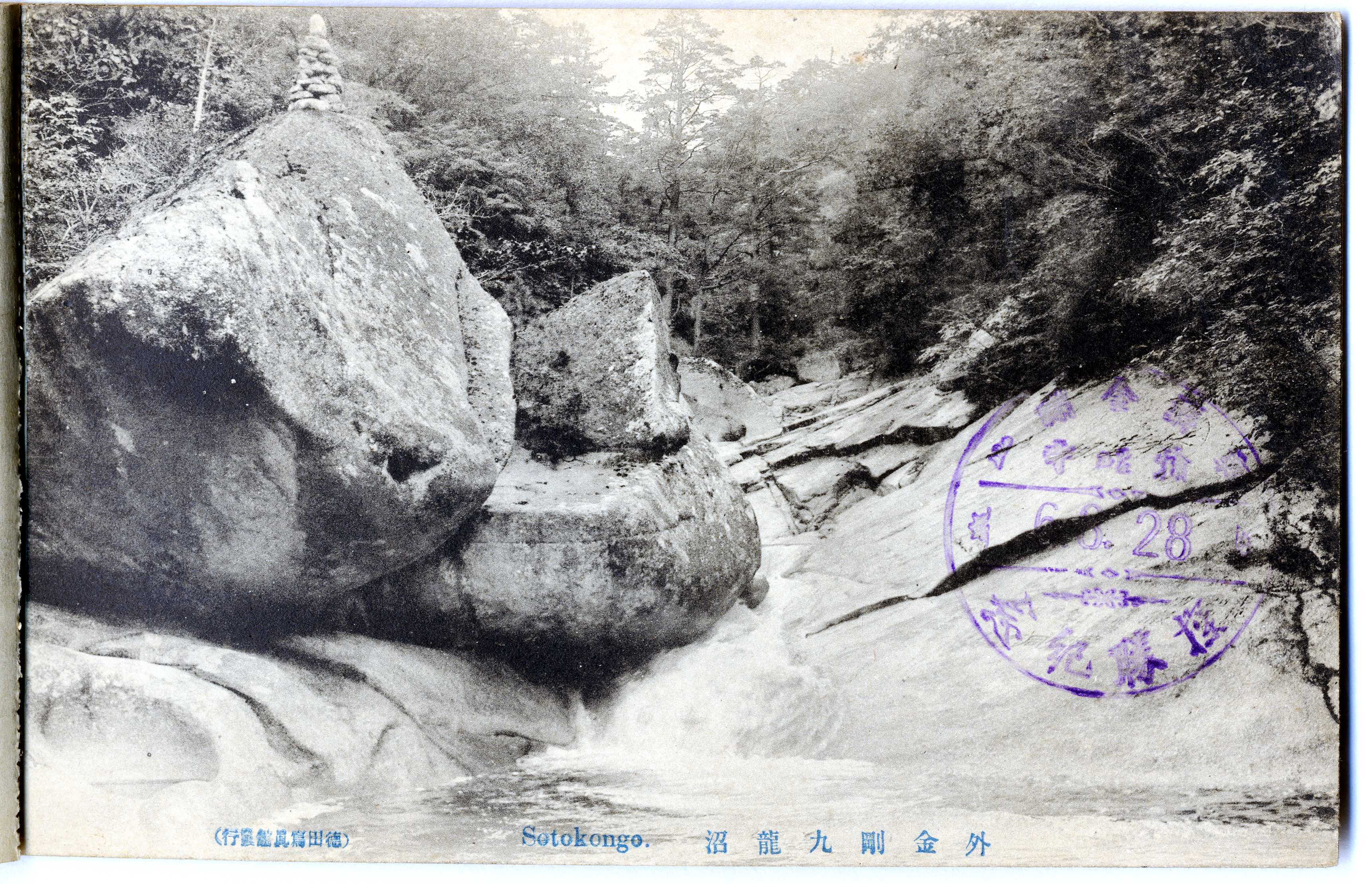 금강산 외금강에 있는 구룡소(九龍沼) 사진이 인쇄된 엽서이다. 좌측 하단에 '도쿠다(德田)사진관 발행' 글씨가 있다.