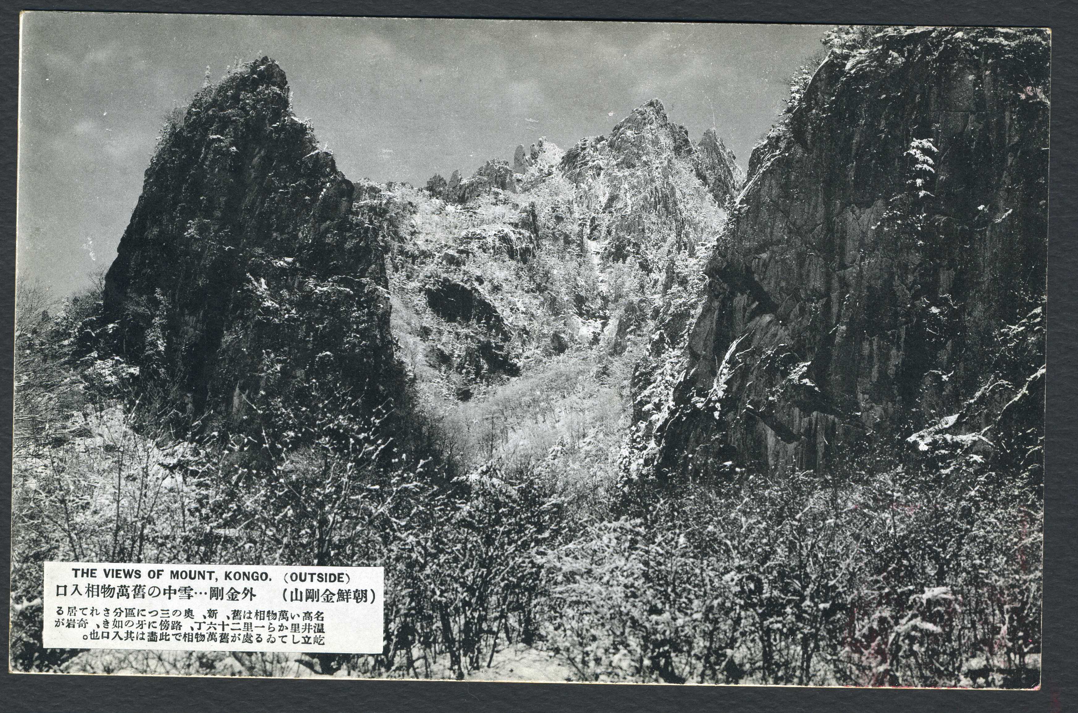 눈이 쌓여있는 금강산 외금강 구만물상(舊萬物相) 입구의 모습을 촬영한 사진이 인쇄된 엽서이다.