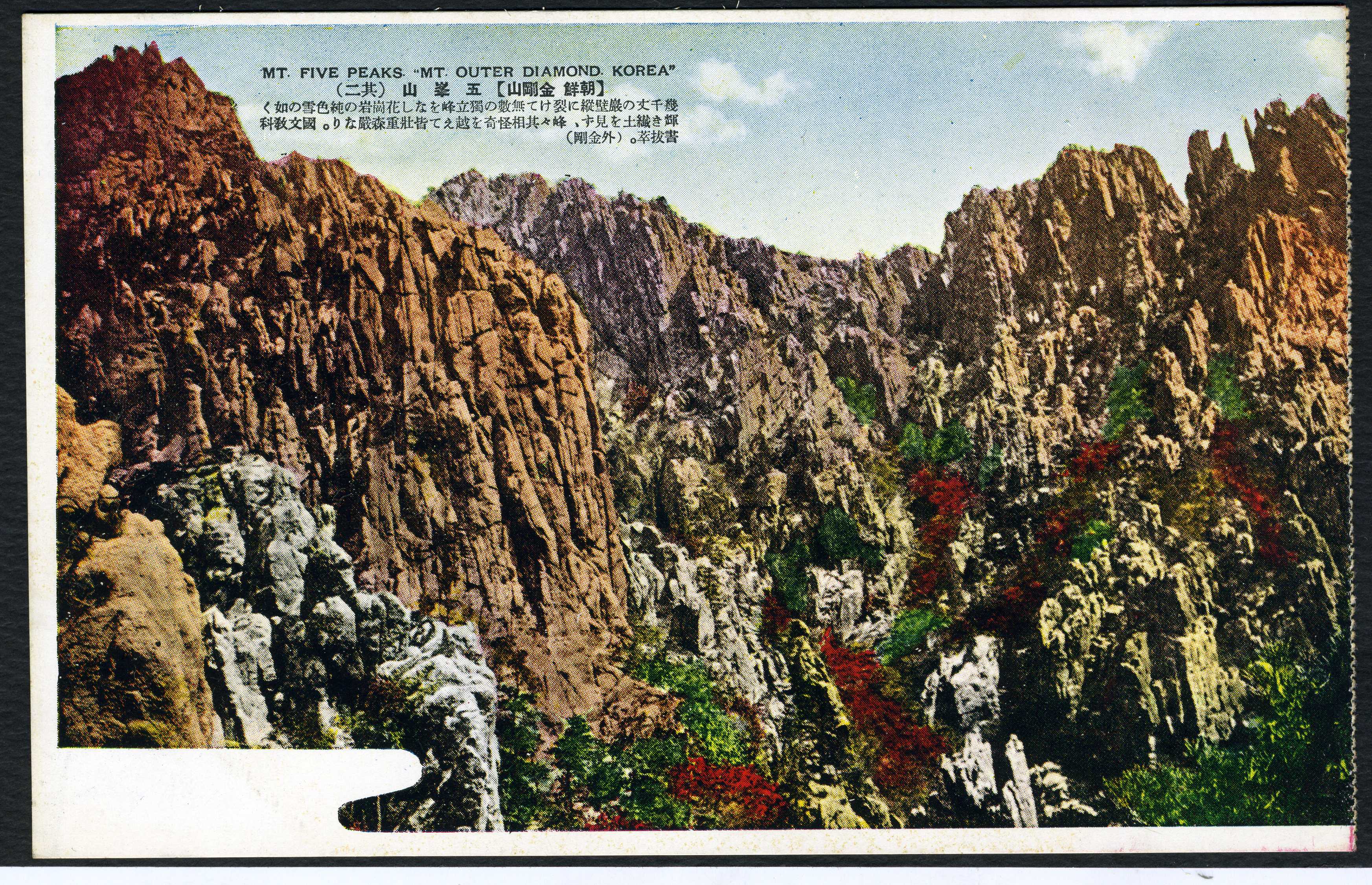 금강산 외금강 오봉산(五峯山)의 사진이 인쇄된 엽서이다. 좌측 상단에 당시 교과서에서 발췌한 금강산 관련 내용이 있다.