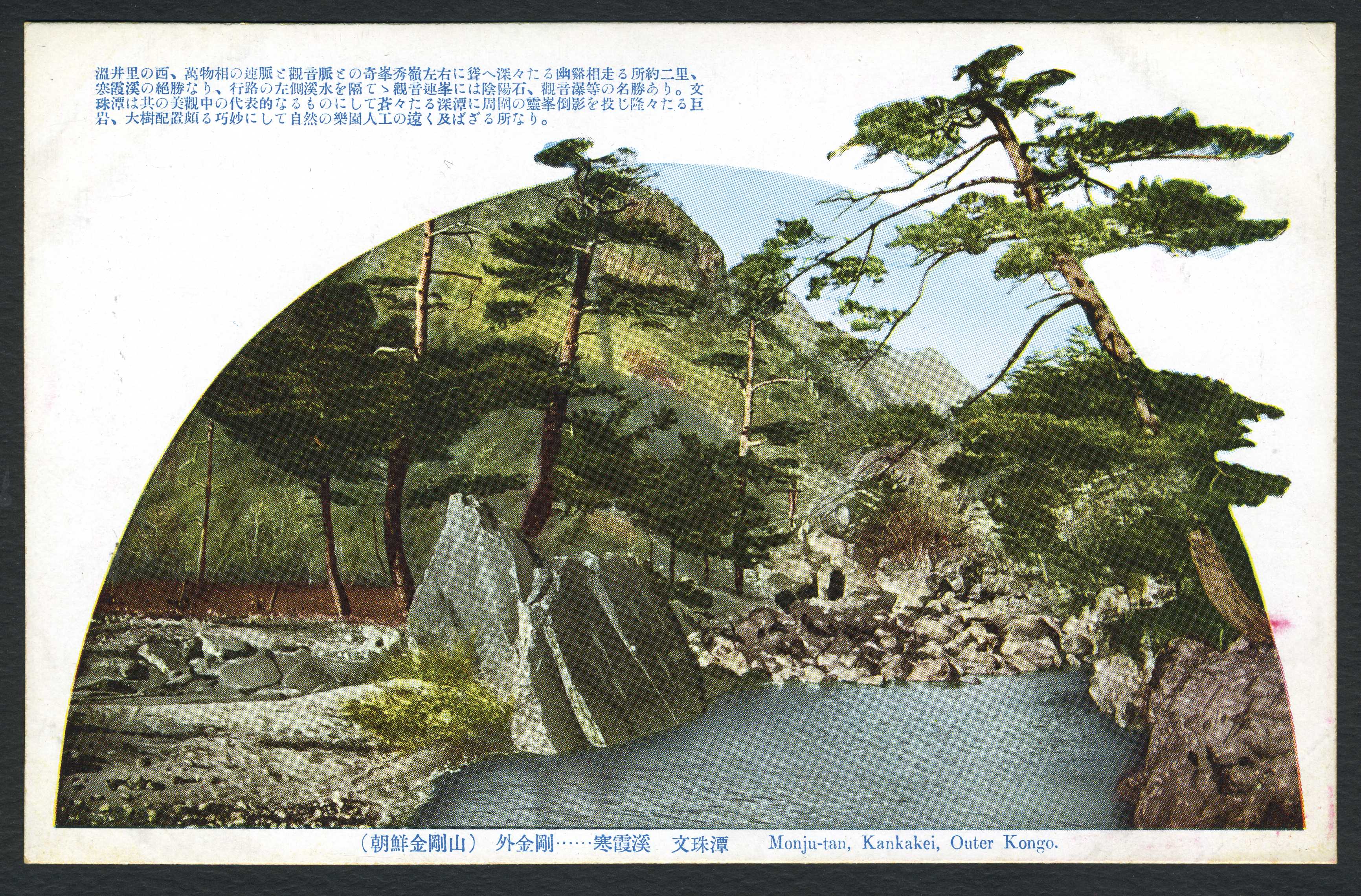 금강산 외금강 한하계(寒霞溪)에 있는 연못인 문주담(文珠潭) 풍경 사진이 인쇄된 엽서이다. 좌측 상단에는 문주담에 대한 설명이 있다.