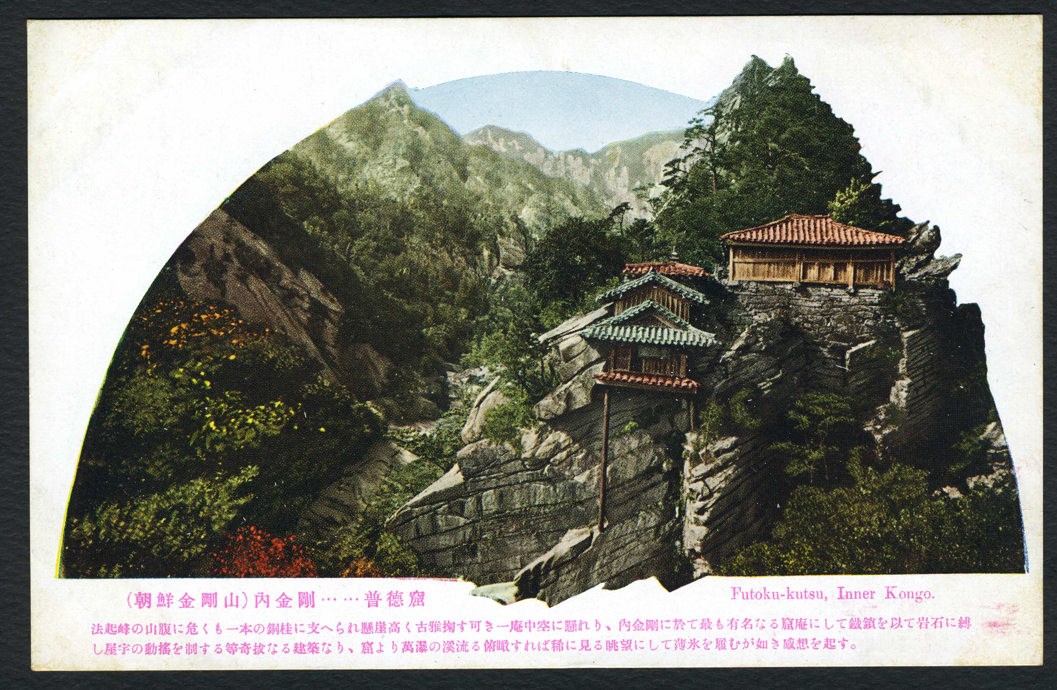 금강산 내금강에 있는 사찰 보덕굴(普德窟)의 사진이 인쇄된 엽서이다. 사진 하단에는 보덕굴에 대한 설명이 있다.