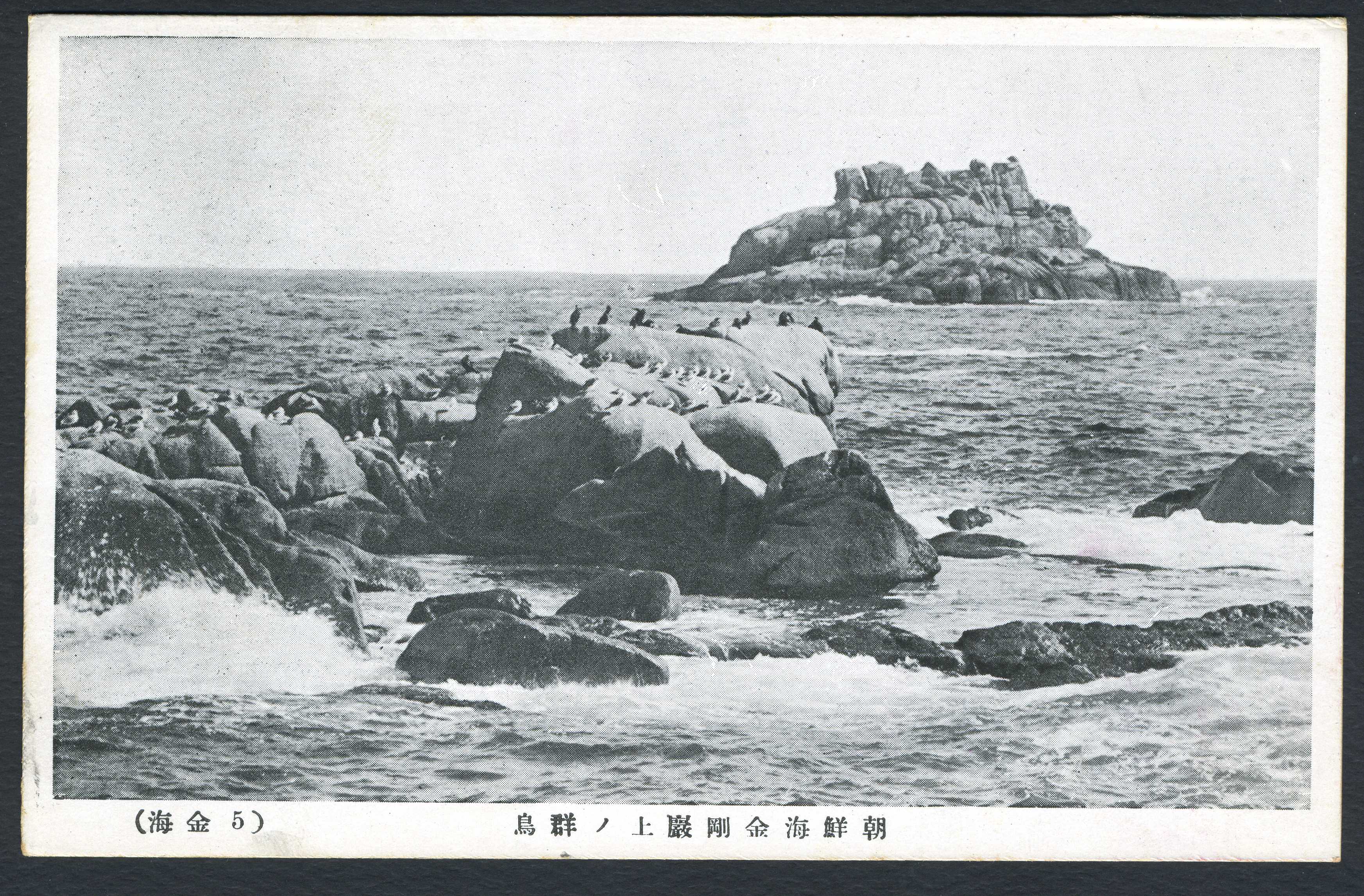 금강산 해금강 바위 사진이 인쇄된 엽서이다. 바위 위에는 새들이 앉아 있다.