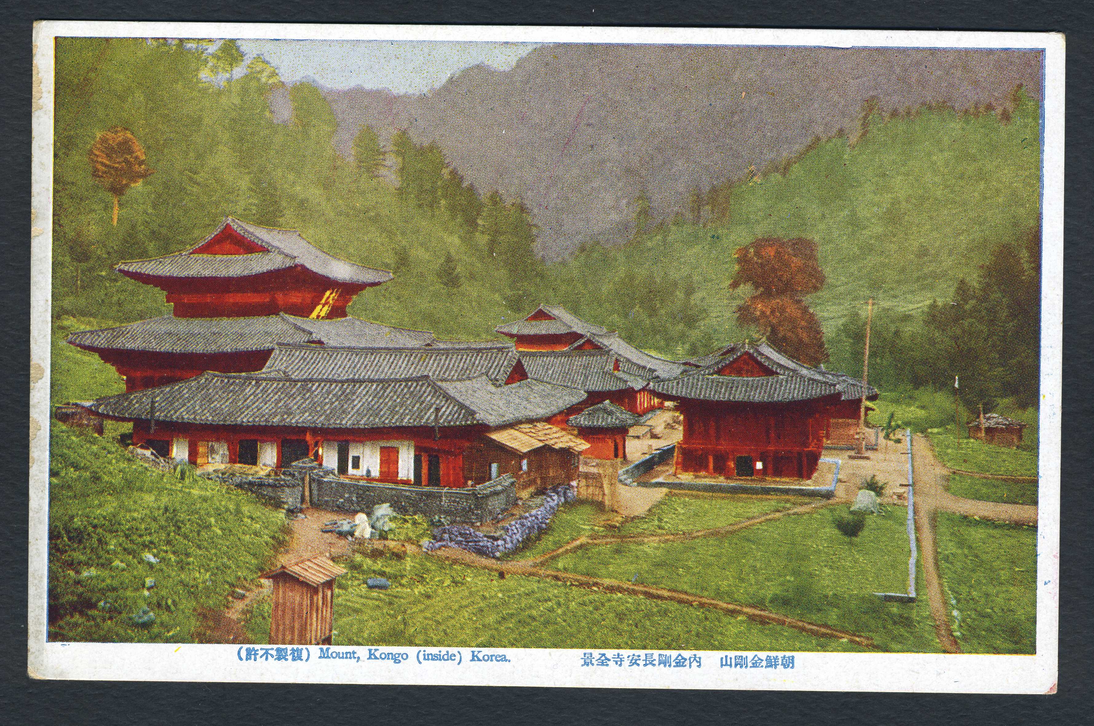 금강산 내금강에 있던 절인 장안사(長安寺)의 전경 사진이 인쇄된 엽서이다.