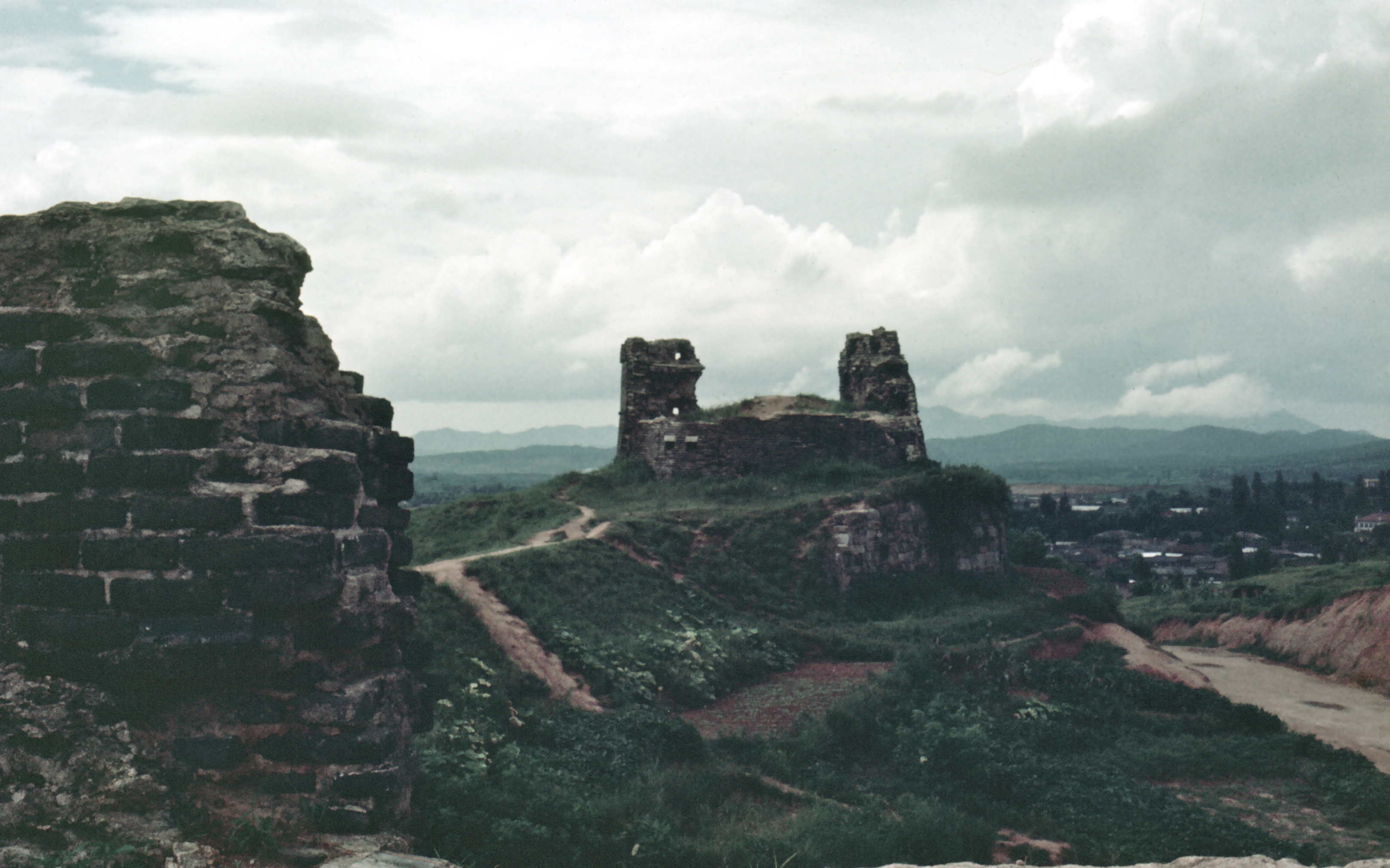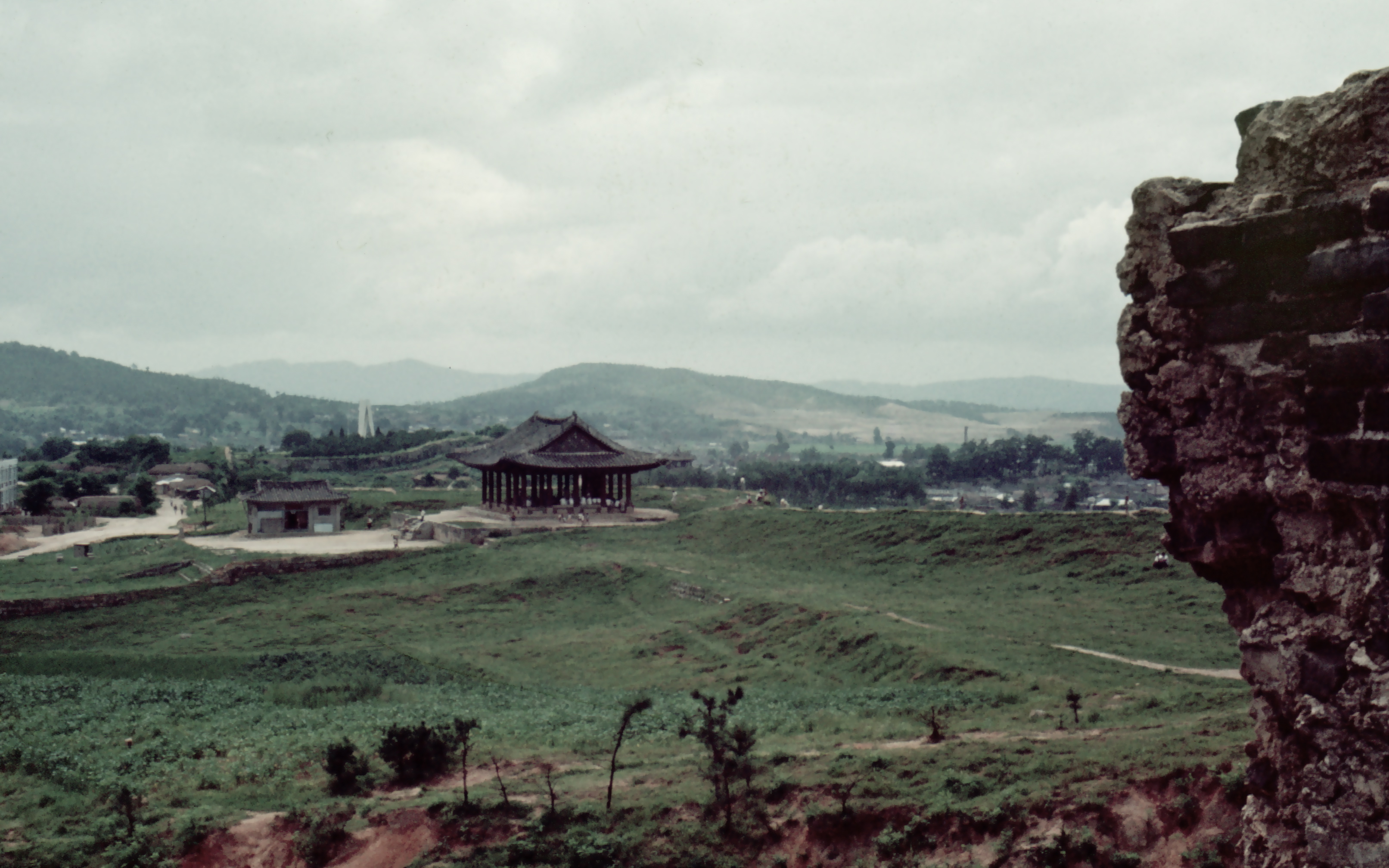 허물어진 동북노대에서 바라본 동장대 안에는 사람들로 북적인다. 그 너머 높게 솟아있는 하얀 조형물은 호국영령을 위하여 1956년에 건립된 충혼탑이다.