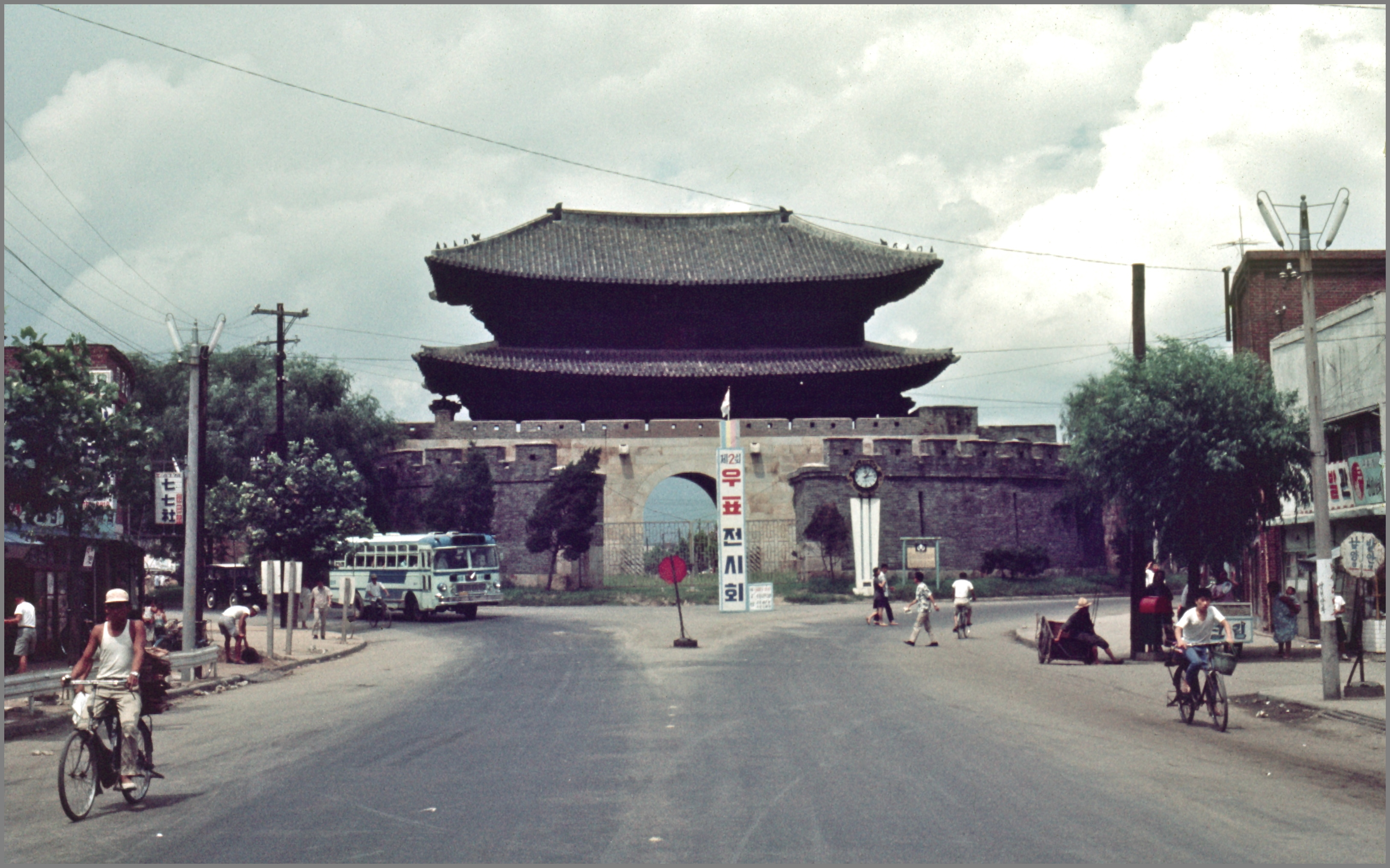 1963년 옹성의 여장을 정비한 후의 위용을 되찾은 팔달문이다. 문 앞에 제2회 우표전시회 입간판이 보인다. 좌측에 시계탑이 서 있는데 게리 헬쎈의 1967년 사진에서는 볼수 없는 것이다. 팔달문 앞으로 잘 포장된 도로를 활보하는 사람들과 오가는 자전거, 버스 등은 전쟁의 그늘을 벗어나 활기찬 번화가의 모습을 전해준다.