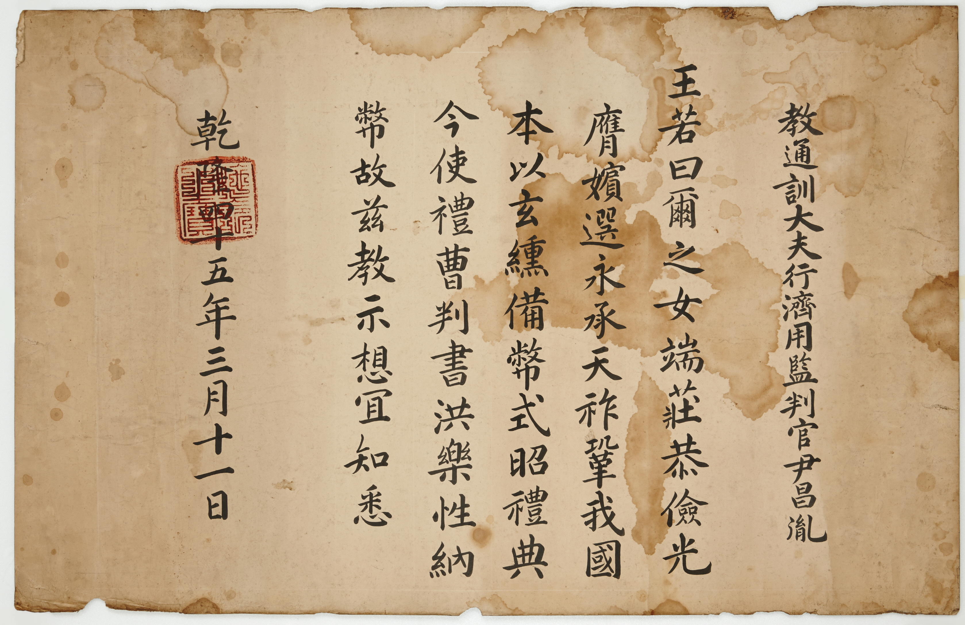 1780년 3월에 정조가 윤창윤(尹昌胤)의 딸을 후궁으로 맞으면서 보낸 납폐교서다. 정조의 비빈은 정비 효의왕후(孝懿王后, 1754~1821)를 비롯하여 후궁으로 원빈홍씨(元嬪洪氏, 1766~1779), 화빈윤씨(和嬪尹氏 1765~1824), 의빈성씨(宜嬪成氏, 1753~1786), 수빈박씨(綏嬪朴氏, 1770~1822)가 있다. 정조는 자식이 귀하여 효의왕후가 자식이 없었고, 첫 번째의 후궁인 원빈홍씨도 후궁이 된지 1년이 안되어 후사없이 죽었던 상황으로 화빈윤씨를 맞은 것이다. 국왕이 비빈을 맞이하는 국혼을 할 때는 전국에 금혼령을 내리고 삼간택을 하였다. 『승정원일기』에 의하면 1780년 2월 28일에 초간택을 하고, 2월 30일 재간택을 했으며, 3월 10일에 윤창윤의 딸로 최종선택을 한 다음 3월 12일 자경전(慈慶殿)에서 가례를 행하였다. 이 문서는 바로 화빈윤씨와 가례를 행하기 전날 3월11일에 홍낙성(洪樂性)을 보내 납폐를 행하는 교서다. 가례를 올린 후 화빈에 봉해졌고 경수궁(慶壽宮)이란 궁호를 얻었다. 1781년 화빈윤씨가 임신하여 얻은 서장녀는 일찍 죽었다.