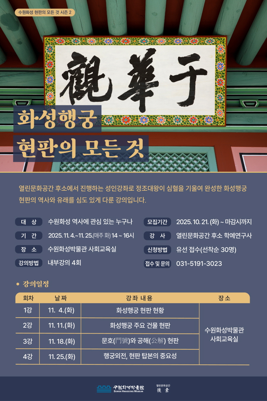 전년도에 진행되었던 <수원화성 현판의 모든 것> 시즌2인 <화성행궁 현판의 모든 것> 강의를 수원화성박물관에서 진행합니다.