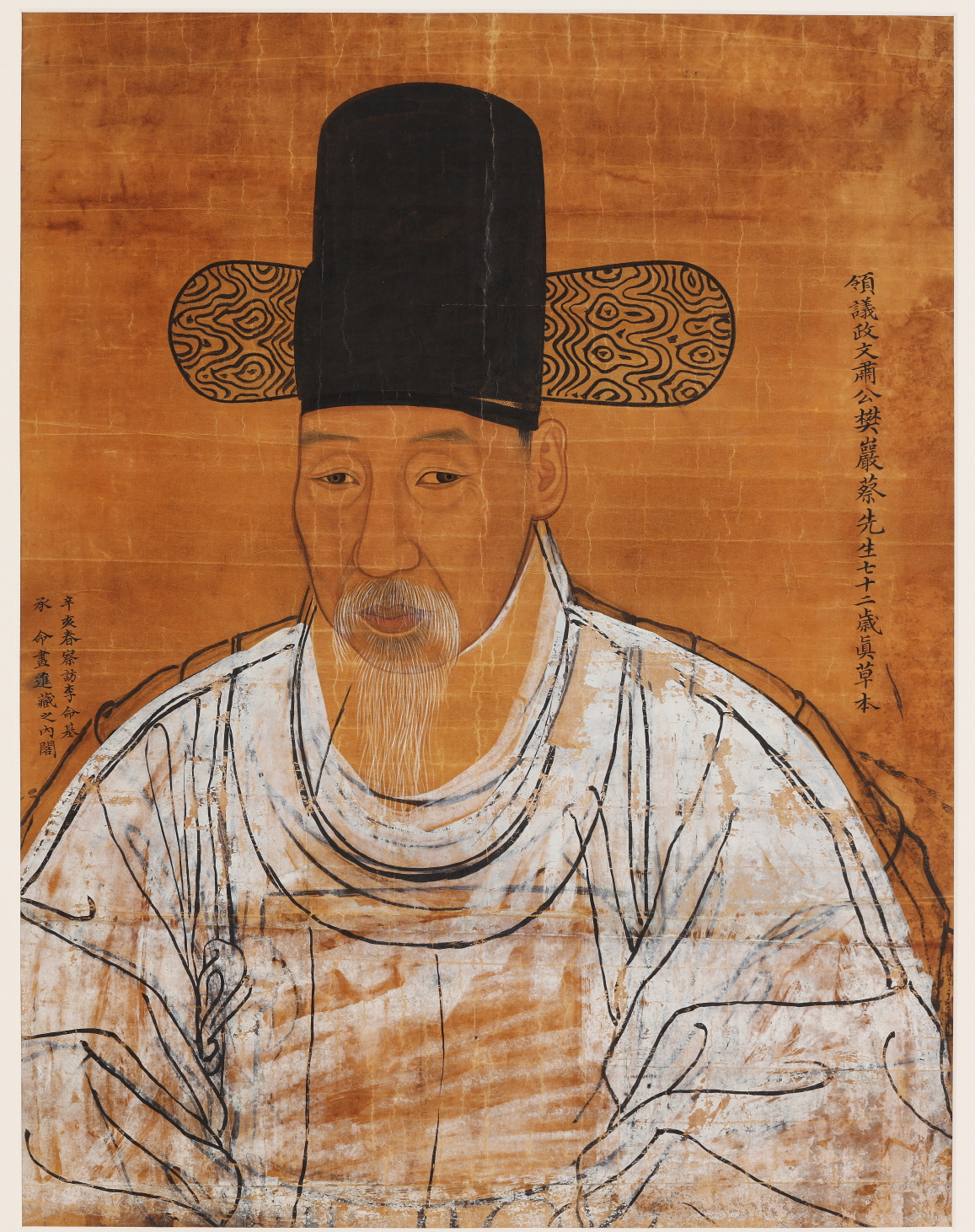 채제공 72세 때 초상 흑단령포본의 유지초본이다. 선묘로 간략하게 윤곽만을 그리지 않고 먹과 담채로 마치 정본(正本) 초상을 그리듯 하였으나 전신이 아니라 반신상이다. 뒷면의 얼굴과 흰 창의 등에는 배채(背彩) 기법을 사용하여 색감이 은은하게 배어나오도록 하였다. 단령의 어깨부분 수정을 위해 호분을 사용하였는데, 흑단령포본 정본의 어깨부위 수정 윤곽선과 정확히 부합된다. 이 초본은 화가의 작화과정(作畵過程)을 생생하게 보여주는 흥미로운 자료다. 화면 우측에는 '영의정 문숙공 번암 채선생 칠십이세 진 초본(領議政 文肅公 樊巖 蔡先生 七十二歲 眞 草本)'이라는 제가가 쓰여 있고 좌측에는 '신해(1791) 춘 찰방 이명기 승명화 진장지내각(辛亥 春 察訪 李命其 承命畵 進藏之內閣)'이라는 기사가 부기되어 있어 이명기가 왕명으로 그린 채제공 초상이 내각에 수장되어있음을 알 수 있다.