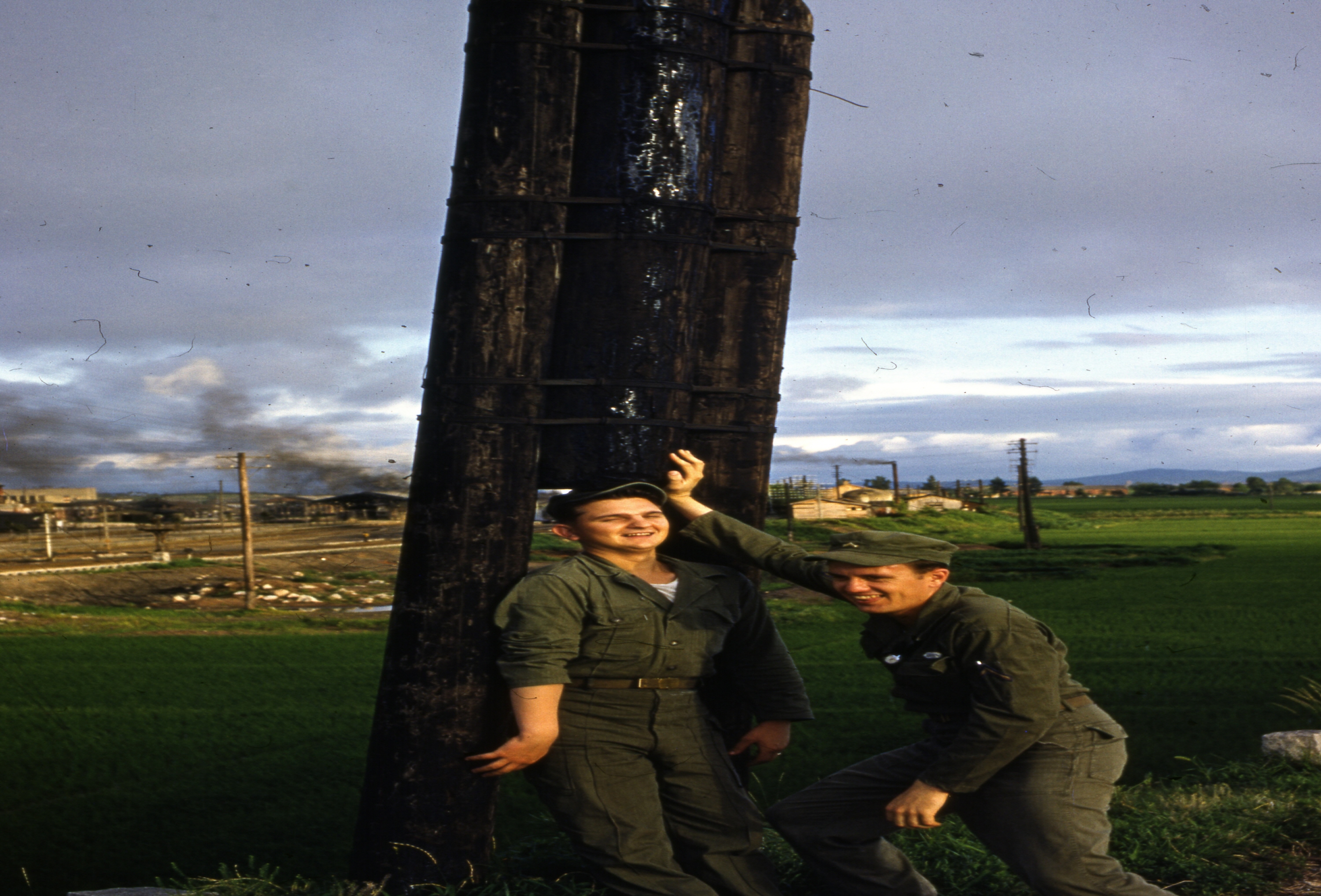 전봇대에 기대고 있는 미군들이 익살스런 표정과 동작을 취하고 있는 모습을 찍은 사진이다.