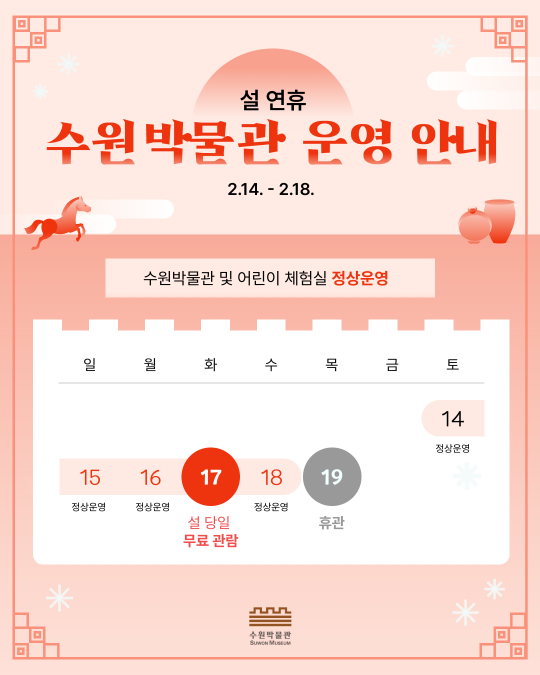 수원박물관은 설 연휴 기간인 214()부터 18()까지 정상운영하며, 19()은 휴관입니다.