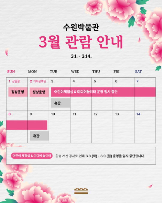 3. 3.()~3. 9.(), 환경 개선 공사로 인해 어린이체험실과 미디어놀이터 운영을 임시 중단합니다.