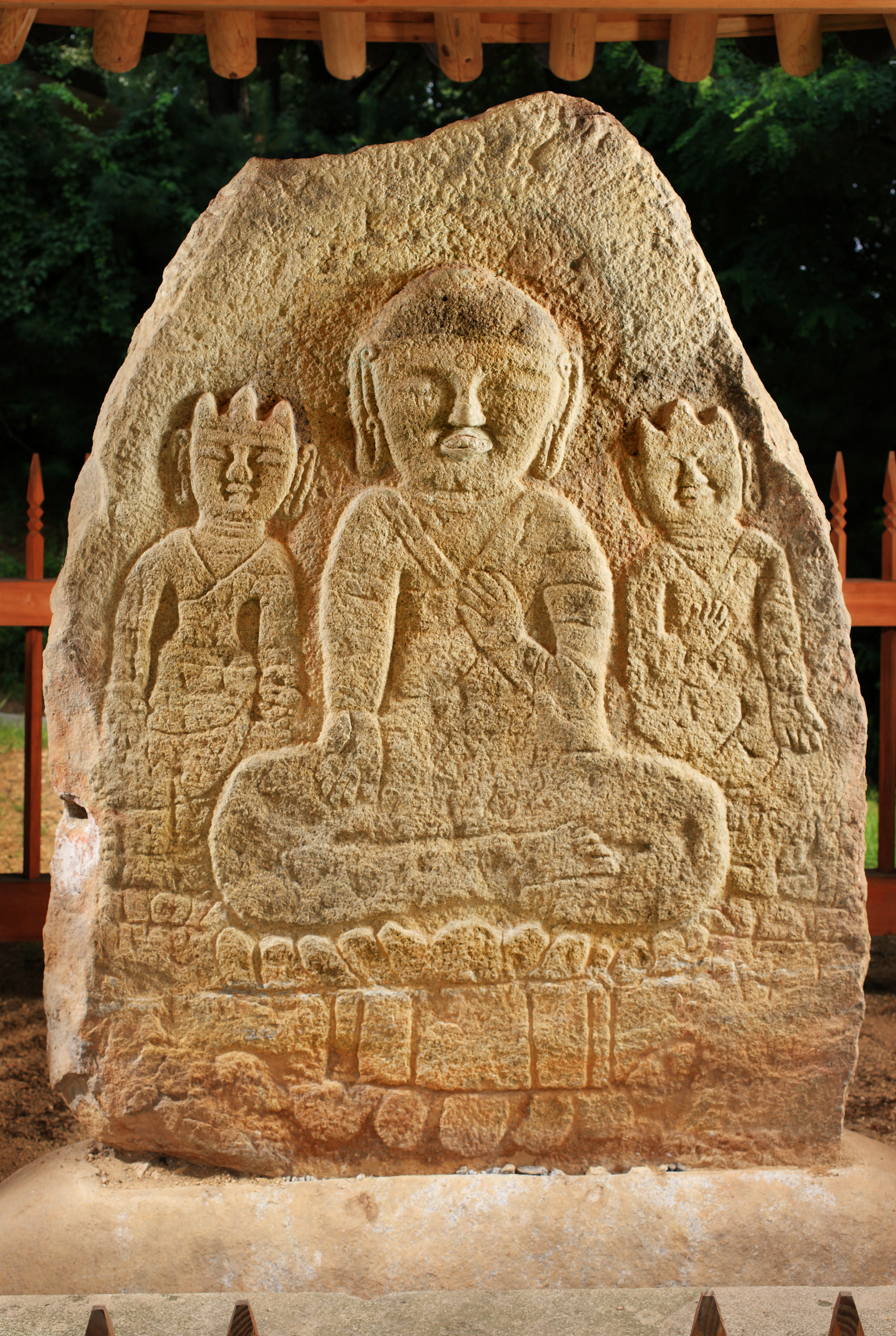 협시 보살상이 착용한 삼산형三山形의 보관寶冠은 이 작품의 가장 큰특징이다. 과감하게 생락된 옷주름, 앙련仰蓮과 복련復蓮으로 이루어진 연화대좌의 소박한 형태와 세부적인 조각 수법 등에 비추어 볼 때 제작시기는 고려중기 이후로 추정된다.