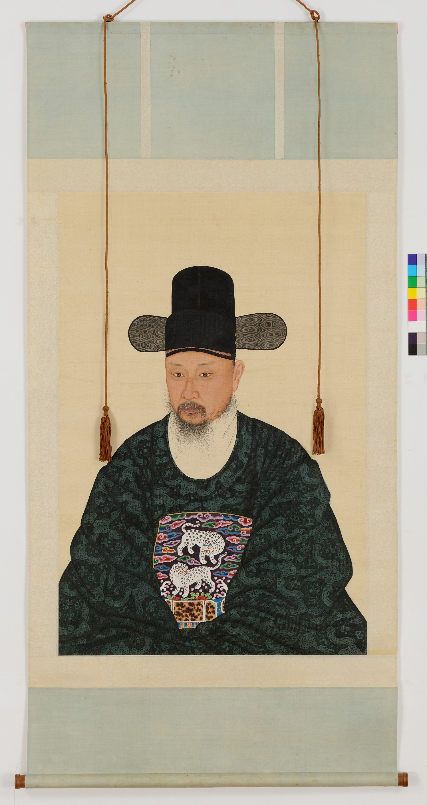김후(金㷞, 1761~1805)는 정조시대의 무신으로 본관은 해풍(海豊)으로 자는 광중(光仲)이며 증호조참판(贈戸曹參判) 김상걸(金相傑, 1727~1798)의 아들이다. 1771년 (영조 47) 정시무과에 급제한 후 출사하여 수원부를 비롯한 여러 관직을 거쳐 1793년에는 경기 중군이 되어 경기지역의 모든 군사 업무를 실질적으로 통솔하게 되었다. 이는 정조가 의도적으로 수원 토박이이 srlagn를 화성성역 시작 1년 전에 중용한 것이었는데, 김후는 1794년 2월 화성성역의 별감동(別監董)이 되어 막중한 임무를 수행하였으며 성역이 끝나자 그 공을 인정받아 숙마(熟馬) 1필을 하사받았다 이후 황해병사를 거쳐 내금위장(內禁衛將)에 이르렀다. <김후영정>은 40대 초반의 모습으로서, 오사모를 쓰고 흉배가 부착된 단령을 입고 있는 상복본(常服本)이다. 가슴에는 호랑이 두 마리가 수 놓은 흉배가 부착되어 있어 무관 당상관임을 알 수 있고, 허리에는 1품임을 나타내는 서대(㓾帶)를 두르고 있다. 제작시기는 화성성역을 마치고 그 공로를 보상 받은 시점인 1796년 후반으로 추정한다. 문관 영정보다 수적으로 드문 무관 영정 가운데 단연 돋보이는 작품으로 평가받고 있다. 본 작품은 화성성역에 실제로 깊게 관여한 인물의 후손들에 의해 거의 220년간 대를 이어 전해져 온 것으로, 영정을 보관하던 함과 군복에 착용하는 모자 장식인 호수(虎鬚) 및 호수함과 함께 2012년 수원화성박물관에 기증되었다.