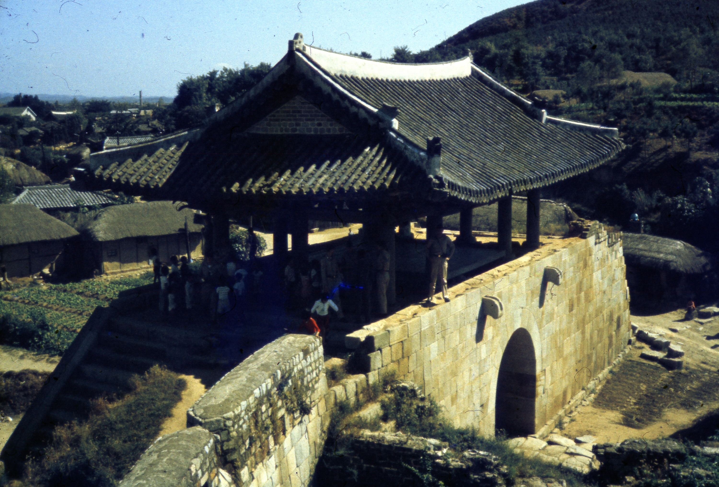 화서문 문루 위의 사람들과 군인들의 모습을 서북공심돈 위에서 내려다보며 찍은 슬라이드 필름이다.