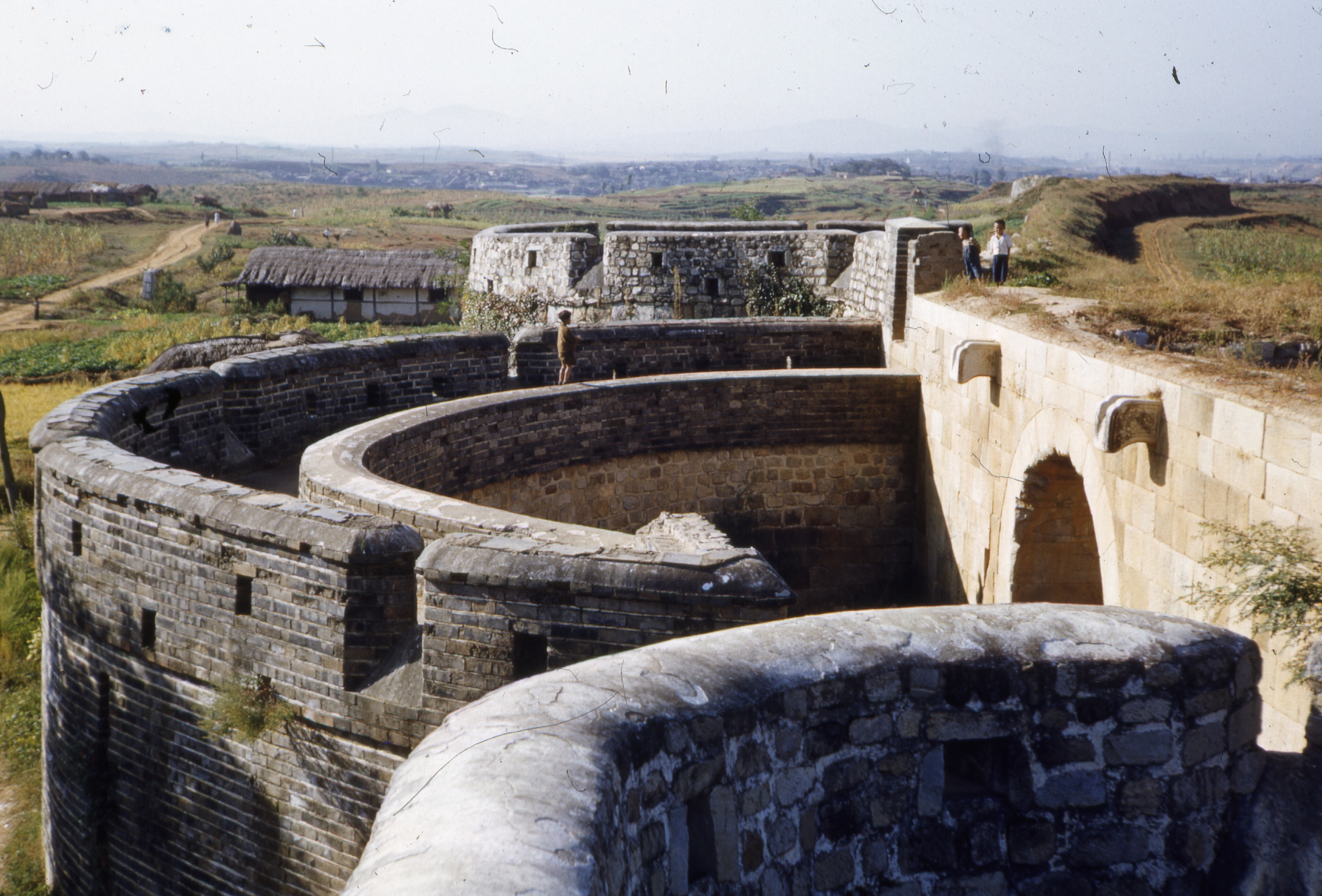 한국전쟁으로 누각이 파괴된 창룡문의 옹성 위에서 아이들이 뛰어놀고 있는 모습이다.