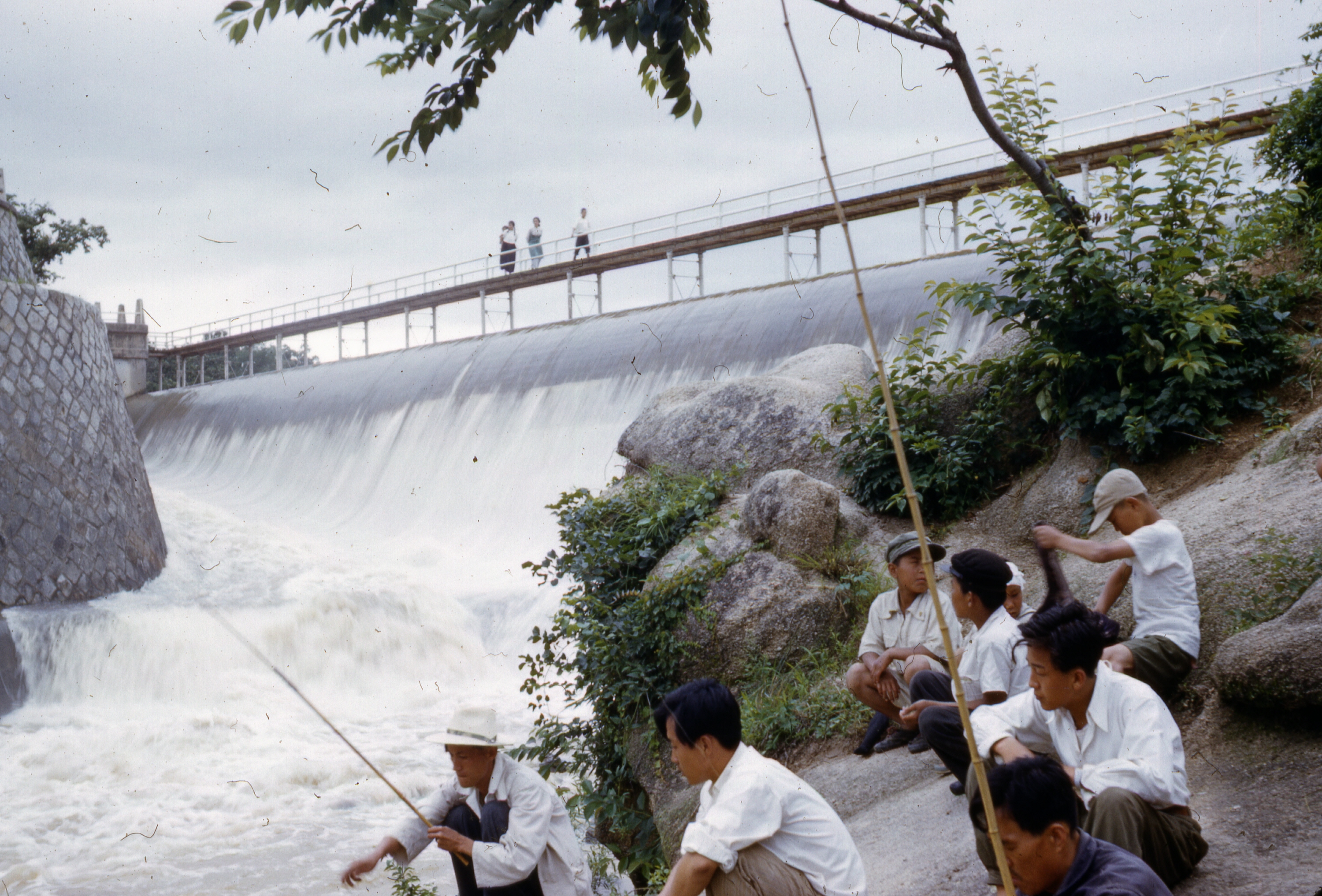 서호의 물을 뱡류하는 여수로(餘水路)와 낚시하는 사람들
